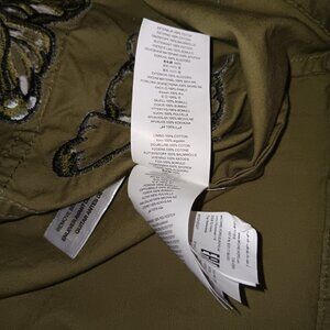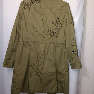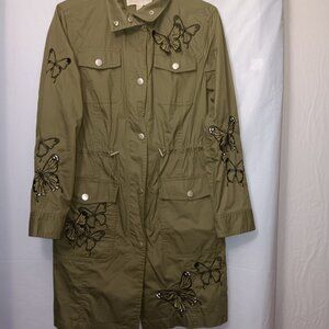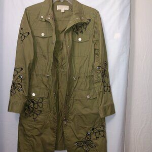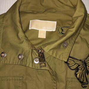 Size XS - Women's MICHAEL MICHAEL KORS olive green color long-sleeve lightweight utility cargo style jacket with butterflies has functional waistline drawstring, functional snap button pockets, and functional zipper and snap button closure the material is 100% cotton in gently used condition
