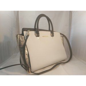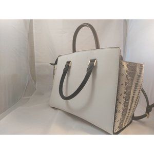 Get this elegant Michael Michael Kors Selma Sachel Bag, White body, black straps and Snake print sides. Pre owned in excellent condition, no wear, clean.