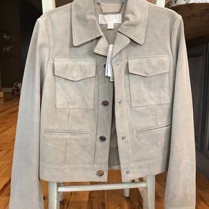 New with Tags Beautiful, elegant, and chic designer suede jacket in a gorgeous khaki color. Completely lined and in perfect condition. Never worn. No marks, stains, smoke free home.