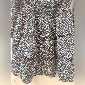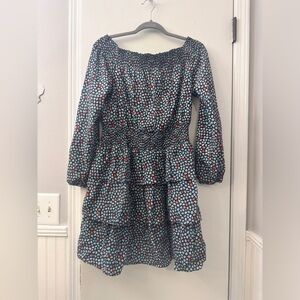 Michael Kors' T Palm printed minidress features an off-the-shoulder neck, long sleeves, and a tiered flared skirt with a bold print.