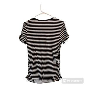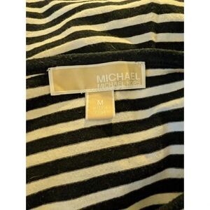 In good pre owned condition this Michael Michael Kors short sleeve crew neck T-shirt is a soft, comfortable fit. The black striped cotton blend fabric and zipper sleeves gives it a chic and stylish look, perfect for any occasion. The elastic gathered sides ensure a comfortable and flattering fit for any woman.