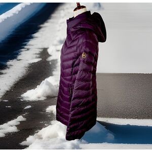 The product is a stylish and practical Michael Kors Women's Quilted Down Packable Hooded Wine Puffer Coat in size M. Made with a durable nylon outer shell and filled with cozy down insulation, this mid-length coat features a solid wine color with quilted accents. The lightweight and packable design make it perfect for all seasons, while the hooded style adds extra warmth and versatility. This coat is a fashionable and functional addition to any woman's wardrobe.