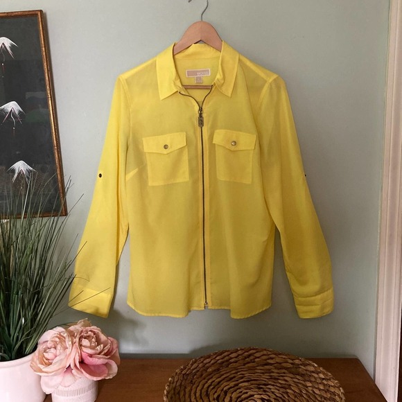 MICHAEL MICHAEL KORS Women's Yellow Full Zip Long Sleeve Collared Blouse | L