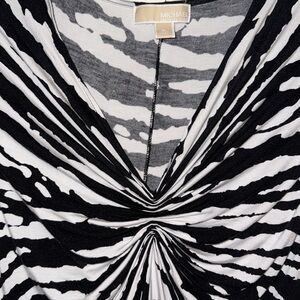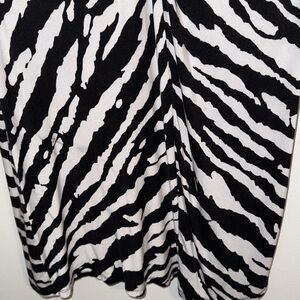 Stylish zebra print dress in black and white. Features a gathered front design. Gathered in front at v neck line. Very pretty & soft.