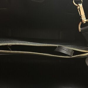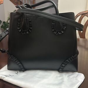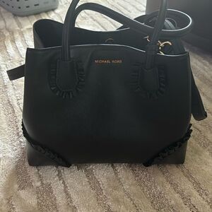 Black 'Mercer Gallery' 3-compartment shoulder bag from Michael Michael Kors. Made of leather. Finished with ruffle. Snap fastening. 2 semi-round handle. Detachable and adjustable shoulder strap. Interior has 3 slip pockets and 1 zip pocket. Gold-tone metal hardware