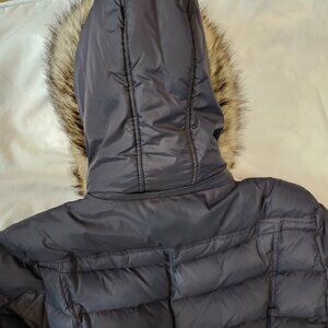 faux fur trim which zips off. The length of coat from center back to hem is 36 inches long.