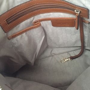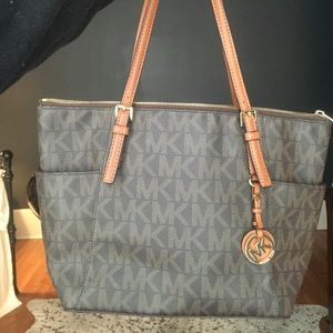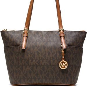 Brown Jet Set Logo TopZip Tote. Buckled shoulder straps. Outside pockets. Inside, monogram satin lining; One zip and four open pockets! Never used!
