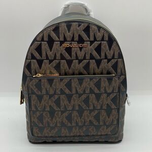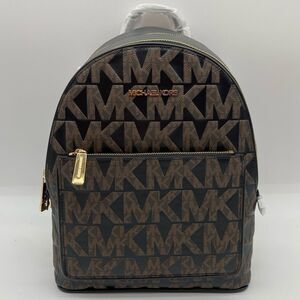 This Michael Kors Adina zip-around backpack in brown/black signature logo stamped coated canvas and smooth leather is new with tags in manufacturer’s packaging. Features include: