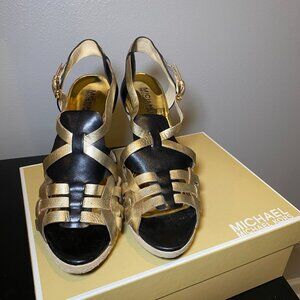 Black leather and metallic Gold strappy heel. Heel height 5 inches from floor to the top of the footbed. Comfortable. Rarely worn