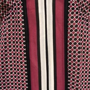 Excellent condition no stains rips or fading. Halter neck, v-neck, fit and flare asymmetrical hem dress. Zips in back. Maroon (purpleish red), cream and black circle, diamond and striped geometric print.