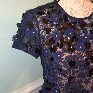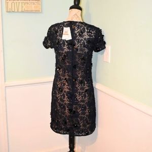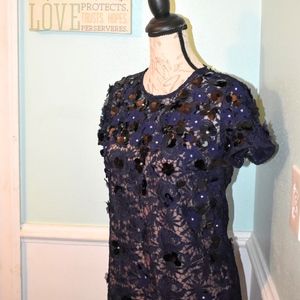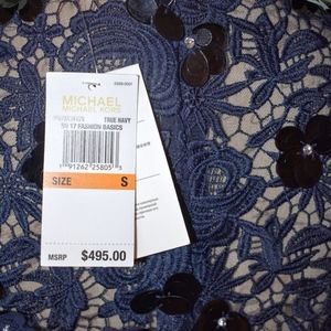 MICHAEL Michael Kors Beaded Cocktail Dress. Comes with under garment beige slip. Dress is intricate beaded with a see though design. Perfect for a wedding or other formal event. Colors is navy with black tulle and beading pieces attached throughout. Size is Small Approx Measurements w/minimal variations: 26'' length from armpit 34'' bust 31'' waist Made in India Shell and Exterior: 100% Polyester Dry Clean Only #A