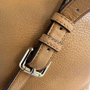 Michael Kors medium cross-body messenger bag in camel pebble leather. The condition is good. There are some minor marks to the exterior. The interior is in great shape; there is one small pen mark. - Pebble Leather - Gold-tone hardware and embellishments - Adjustable crossbody strap with 21-23" drop - Interior features 1 zip pocket and 1 open pocket - Key keeper - Top zip closure - Approximate Dimensions 12” W x 9” H x 5” D Shop my closet, buy two items and get 15% off