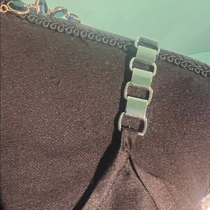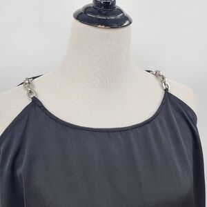 Chic black blouse with cold shoulder design. Features metal accents on straps. Perfect for stylish outings.