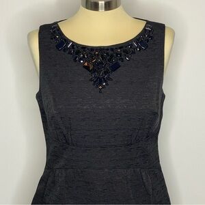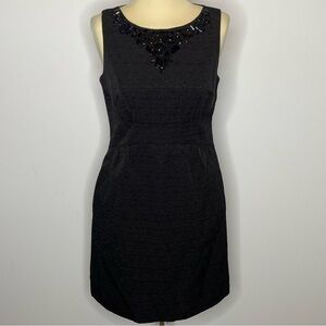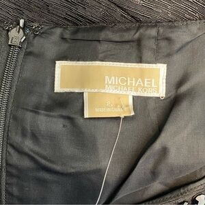 MICHAEL Michael Kors Black Embellished Neckline Dress. Black monochromatic jeweled/sequin/beaded neckline. Subtle sublimated sheen texture to fabric. Hidden center back zipper, pockets in skirt, pleated detailing to accent waistline. New without tags.