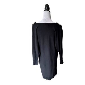 Instant elegance unfolds in this sleek black knit sweater dress. The softly draped cowl neckline frames the face beautifully, while the long sleeves provide comfortable coverage. Note the polished gold zippers at the shoulders, which add a touch of edgy sophistication to this timeless silhouette. The length is perfect for showing off your favorite boots or heels. Envision wearing this dress to a sophisticated cocktail party, a chic dinner date, or even a polished workday look.