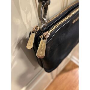 Michael Kors Adele double zip pebbled leather crossbody bag with gold hardware and adjustable shoulder strap. The corners have some rubbing & I don't think the shoulder strap is the original one that comes with the bag. It looks good but also can be easily replaced with a new strap.