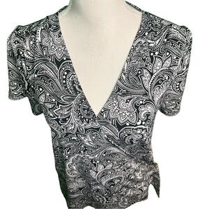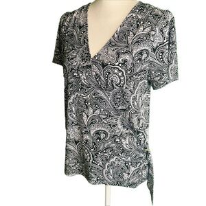 MICHAEL Michael Kors Black & White Paisley Print Faux Wrap Top W/ Buckle Detail
