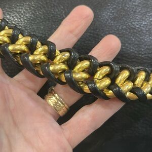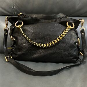 Elegant black leather with gold chain detail. Perfect for any occasion. Stylish and versatile.