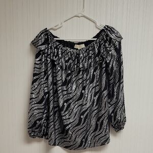 Elegant blouse from Michael Michael Kors with a black and white chain pattern. Features a stylish off-shoulder design. women's sz petite small. New with tags. 199% polyester. 40" chest