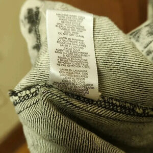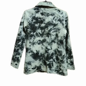 Gray and Black tie-dye trench pea coat. Coloring appearance gives a bleach pattern style. Zipper side pockets. Double breasted button closure. Bought at Loehman's in the early 2000s but never used.