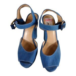 Stylish blue denim platform sandals. Adjustable ankle strap. Perfect for casual outings.