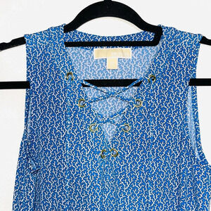 MICHAEL Michael Kors blue & white printed mini shift dress. In excellent condition! V neckline. Lace-up front. Sleeveless. Contrast white & blue striped bottom hem. Effortless shift style. Mini silhouette. Unlined. Bright blue & white abstract print. Size xsmall.