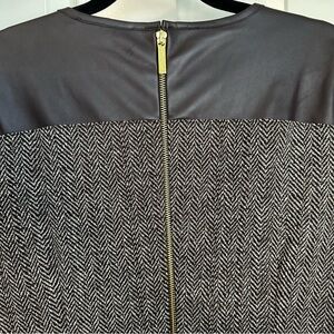 Chic mini dress with faux leather top and textured cream pattern. Lined. Ideal for stylish outings. Great dress for fall!