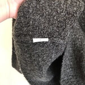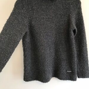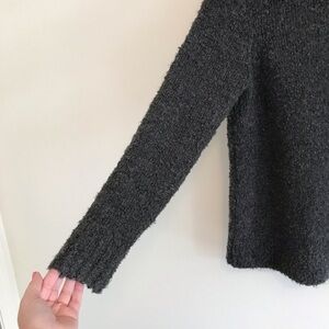 Features: dark gray chunky knit sweater, turtleneck sweater, curly textured knit.
