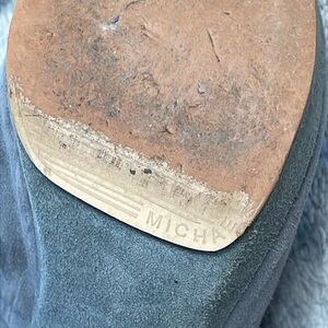 Soft grey suede platform heels with silver tone MK hardware on hook and loop ankle strap.
