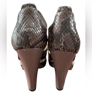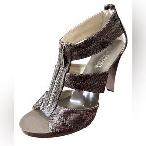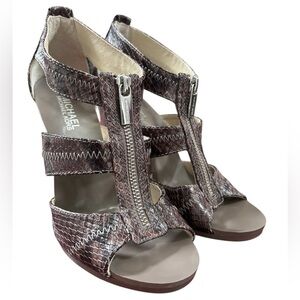 MICHAEL Michael Kors Front Zip Brown Reptile Strappy Leather Open Toe Heels