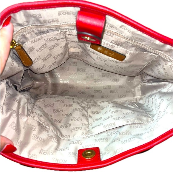 Stylish and spacious, this Michael Kors tote bag features bold red and white stripes. Perfect for adding a pop of color to any outfit.
