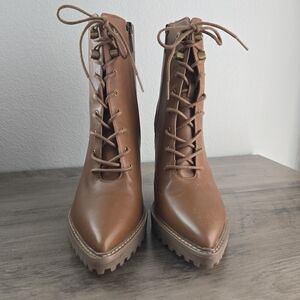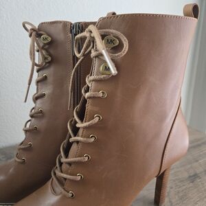 Keywords: MK boots, designer lace-up booties, leather ankle boots, fall fashion shoes, pointed toe heels, stacked heel boots, chic women’s footwear