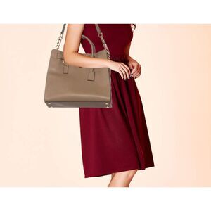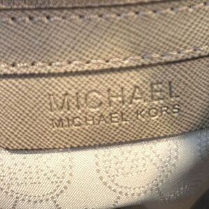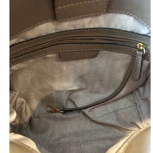 This Hamilton tote is from MICHAEL Michael Kors. It is crafted from beige leather and decorated with an engraved padlock on the front. The bag has two handles, a shoulder strap, and a spacious nylon interior. It is in excellent condition. The gold hardware, corners, handles and bottom of the bag are like new. The interior has a few very small stains. Measures approx 12" x 9" x 4"