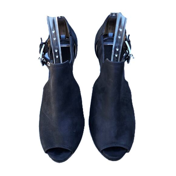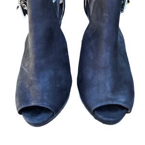 VTG: Showcase, black leather upper booties/heels with peep toe / silver tone etched logo adjustable side buckle closure / stacked hexagon cone heel / platform style / rubber outsole by MICHAEL MK.