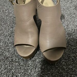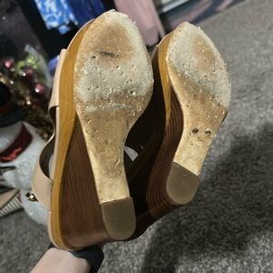 Elevate your style with these cream wedges from MICHAEL Michael Kors, featuring a chic open-toe design and wide crisscross straps. The medium-height wedge heel and comfortable footbed make them perfect for both casual and dressy occasions.only flsw is there is a scuff by the toe and the bottoms have wear otherwise they are in good used conditions size 6.5