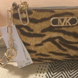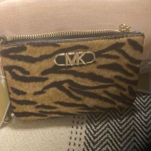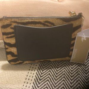 A beautiful holder for your cards and keys with an animal print. Two sections inside with fabric divider. Zipper closure. HairCalf. Spot clean only. Color: MARIGOLD. Approx. measurements: 6''W X 4''H X 0.5''D. NEW with tags.