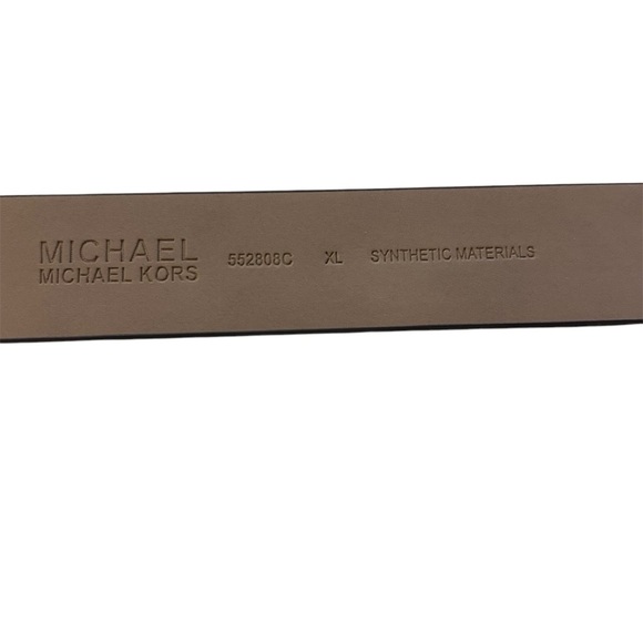 This new stylish belt from Michael Kors features a rich brown monogram pattern with a textured finish, complemented by a gold-toned buckle.