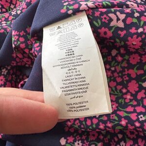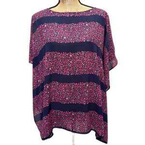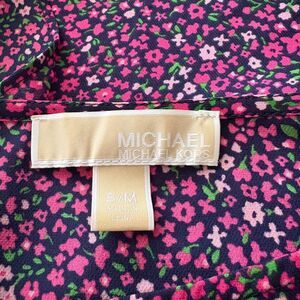 Gorgeous and easy to wear, this Michael Michael Kors blouse features a flowy kaftan-style silhouette in a sheer navy fabric with alternating bands of vibrant pink, green, and white micro-florals. Made from lightweight polyester, it drapes beautifully and offers a flattering, relaxed fit. Great for layering or wearing solo during warmer months.