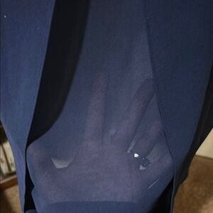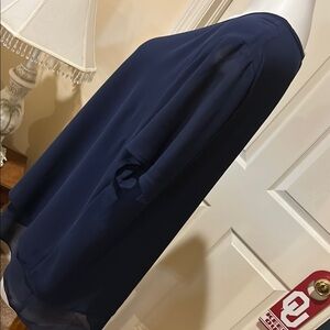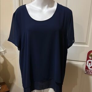 Chic navy blouse with a flowing design. Short sleeves and round neckline. Perfect for versatile styling. Pre owned. Size tag removed. Listing as Large, see measurements.
