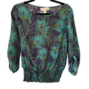 Hey there! I have this amazing MICHAEL Michael Kors Peacock Print Blouse in size Medium that I'd love to share with you. It's absolutely beautiful and has been gently loved, but it's still in excellent condition with no flaws. Just a heads up, the tag is a little loose, but that's the only minor issue. Originally, it was sold for $89.50.