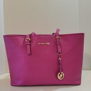 Stylish pink tote with gold accents. Features signature logo charm. Perfect for everyday use. Smoke free home, gently used and well taken care of.
