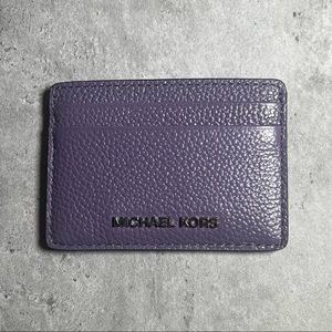 Elegant purple card holder. Features textured leather. MICHAEL Michael Kors logo in black.