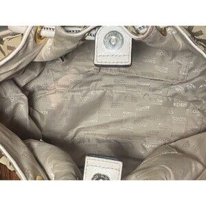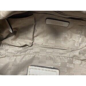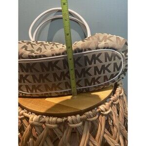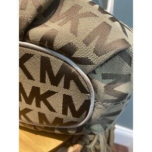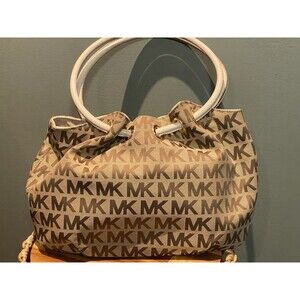This bag features a signature MK logo print canvas with leather trim and gold-tone hardware. The bag has a drawstring and magnetic snap closure, an 9 inch handle drop, and includes interior zipper pocket as well as the accessory/cell-phone pockets. The bag's dimensions are approximately 15 inches in width, 10 inches in height, and 3 1/2 inches in depth. The exterior has leather trim, and the lining is logo-jacquard.