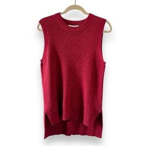 Red metallic ribbed knit sleeveless sweater. Hi-low hem, split side vents. Has stretch. Can be dressed up or down. New with tags.