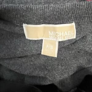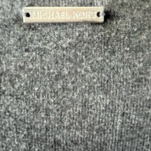 This MICHAEL Michael Kors long sleeve sweater is sequined, V-neck and velvet tie neckline. 60% polyester, 40% cotton, hand wash and lay flat to dry. Neutral gray color. This is the perfect top for date night, dinner, theater, girls, night out, preppy, glam, coquette.