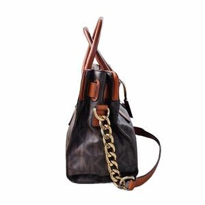 Preloved: Stylish, brown "Hamilton" coated canvas & leather medium satchel/tote bag with signature monogram / dual roll handles / gold-tone hardware / thick chain link leather shoulder strap / logo Jacquard lining / multiple pockets / magnetic snap closure / bottom feet / faux branded padlock / logo emblems by Michael Michael Kors.