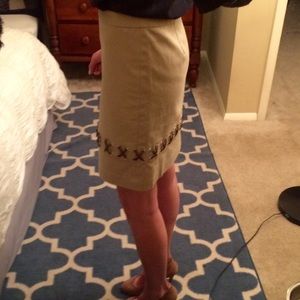 Want to shake up your work wardrobe? This Michael by Michael Kors pencil skirt has trendy brown leather lacing accenting it's bottom. The skirt is true to size and hits about mid-thigh, making it appropriate for work and other professional occasions. It has only been worn a couple of times and is in perfect condition!