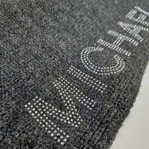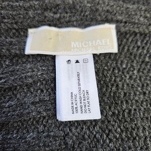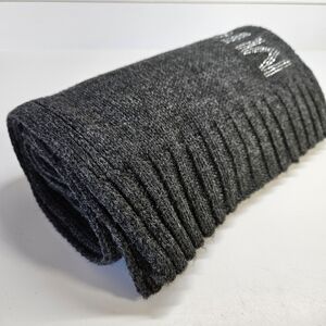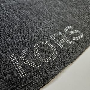 Michael Kors dark gray knit scarf. Logo spelled out on one end in silver sparkles. Material is 100% acrylic.