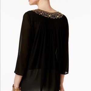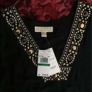 Flashy studs pattern in ornate detail around the neckline of MICHAEL Michael Kors' marvelous tunic. These sparkling embellishments intensify a smart, classic silhouette.