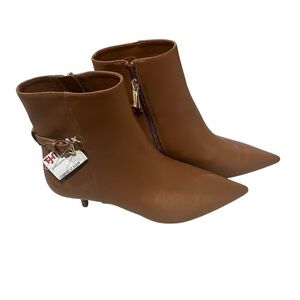 Chic Brown Pointed Toe Ankle Boots — stylish women’s ankle boots in a rich brown color with a sleek pointed toe. Made from smooth faux leather, featuring a convenient side zipper and a decorative strap with gold-tone hardware. Perfect for fall and spring, easily pairs with dresses, jeans, and trousers. Size as listed.